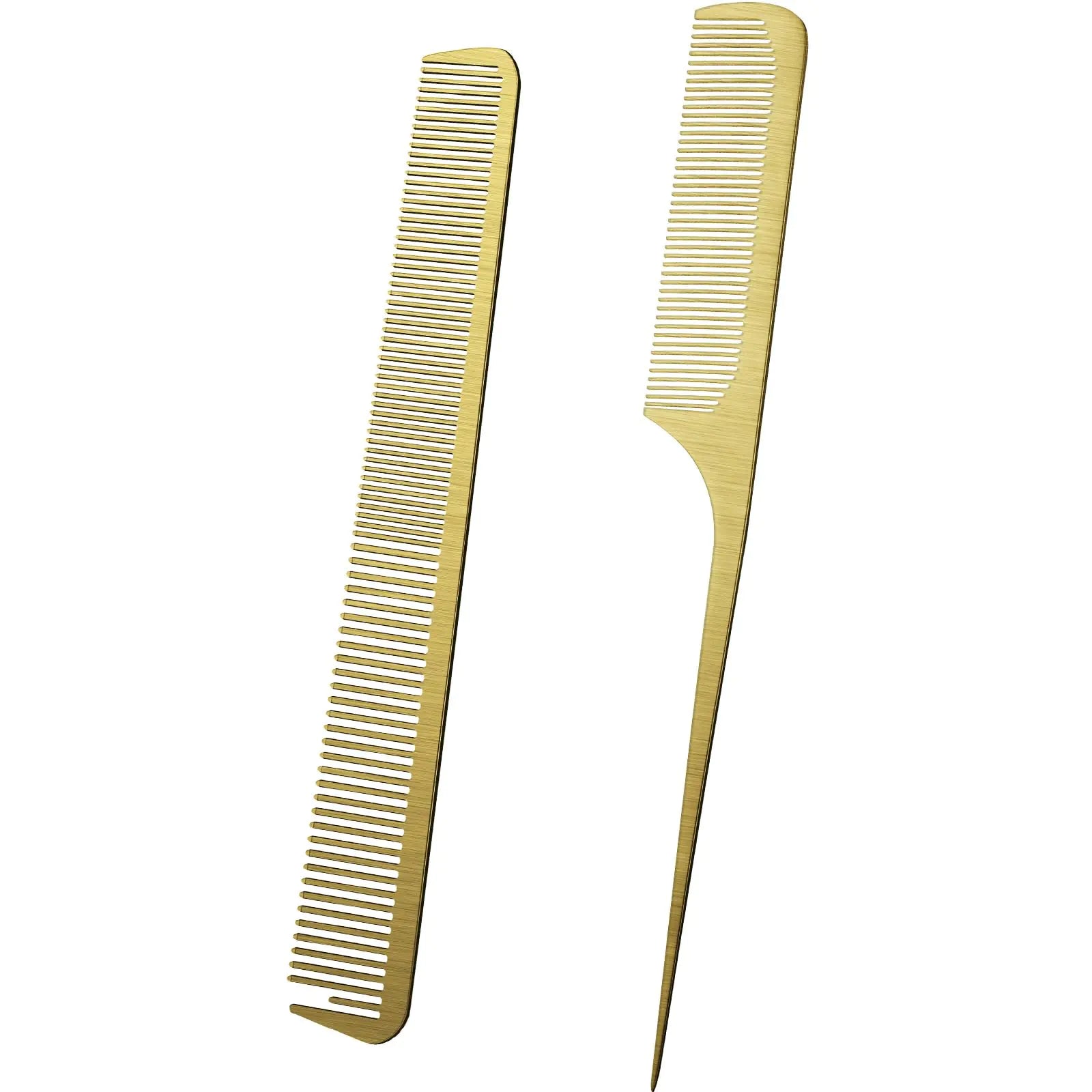 Features:Sturdy not easy to fade or break and comfortable to use. They are polished and smooth surface will not hurt your hair and scalp. They are lightweight and easy to carry you can put it in your bag and use it conveniently.Convenient design:With dense teeth the metal tail combs can comb your hair easily making your hair smooth and not easy to be knotted you can use the thin handle to part your hair which is convenient to do hair styling.Wide application:The gold metal rat tail combs are suitable for your daily use comfortable to use they can be applied in professional hair salons for hair cutting styling or dyeing they are also nice gifts for your friends and family members.Specification:Color: goldMaterial: stainless steelSize: about 8.26 x 0.9 inches/ 21 x 2.3 cmPackage included:2 x Metal rat tail combNote:Pointed parts included please keep them away from little kids.