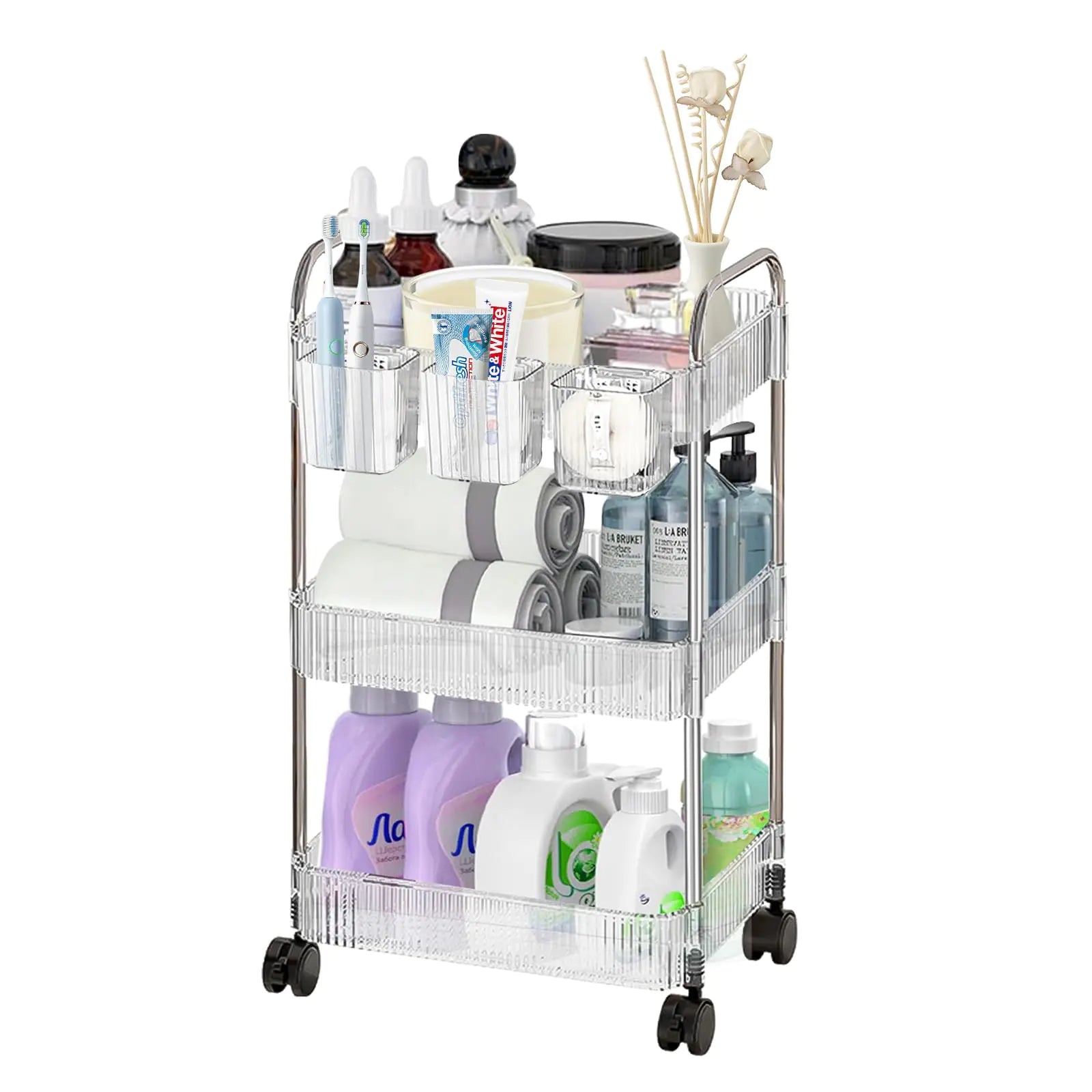 [【Effortless Assembly】Assembly is a breeze with our comprehensive package which includes 4 cosmetics display cases 4 brush organizers 12 steel sticks 2 steel handles 4 wheels and 4 wheel screw caps. No need for screwdrivers or additional tools – simply assemble the parts effortlessly to create various tiers for versatile usage. The assembled acrylic storage cart comes in dimensions of length: 12.5in width: 8in and height: 3-tier: 25in with a 10-inch height between each layer. 【Easy Mobility Stable Stand】Our rolling cart is equipped with four 360° swivel casters for smooth movement. Additionally 2 of these wheels feature brakes ensuring stability when the makeup cart is stationary. Crafted from stainless steel the steel sticks provide sturdy protection for your makeup cosmetics skincare hair tools perfume nail polish lash lotion shampoo toiletries and other beauty products. 【Bedroom Usage】With its sleek acrylic design our storage cart adds a touch of elegance to any space. In the bedroom it serves as a chic makeup organizer allowing you to configure the tiers according to your needs. Use 2 tiers without wheels as a countertop makeup organizer while the remaining 1 tier with wheels effortlessly slide under your vanity table for convenient access. Each tier includes a brush organizer ensuring your makeup brushes are neatly separated and easily accessible. 【Bathroom Usage】】Serve as an efficient bathroom cart on wheels ensuring cleanliness and dryness with the gap between the last layer and the floor. The 10-inch height between layers accommodates toiletries such as lotion and shampoo. The wheels with brakes offer stability in the bathroom environment. 【Versatile Usage】Beyond bedrooms and bathrooms our storage cart finds utility in various spaces including kitchens living rooms dens laundry rooms and baby nurseries. This multifunctional rolling cart adapts to your needs serving as a craft cart book cart art cart diaper cart lash cart esthetician cart snack cart nail cart or makeup organizer.]